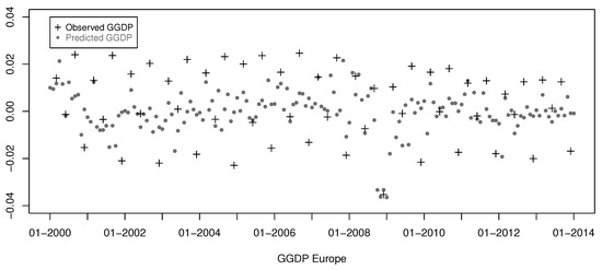 In the case of Europe, the quarterly GDP data and most of the other observable variables used for the estimation are average values of 19 European countries. The derived GGDP will also be the estimation of the average GGDP of those countries. For the European GGDP estimation, 29 variables are used and the data is almost entirely taken from the website of the European central bank (http://sdw.ecb.europa.eu/, accessed on 31 March 2017). Only the VSTOXX volatility index observations are taken from a different source. Those are available at https://www.investing.com/indices (accessed on 5 April 2017). The data used for estimating the US GGDP consists of 34 variables and is available on the webpage of the Research Division of the Federal Reserve Bank of St. Louis (https://fred.stlouisfed.org/ accessed on 27 March 2017).