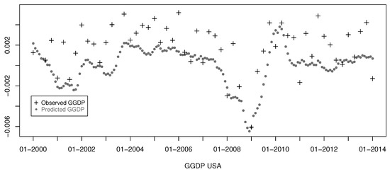 For comparison, we have examined the model with the GGDP estimated using a linear interpolation instead of a dynamic factor model. Before backward-forward selection, this model yields and . After the selection procedure, neither GGDP Europe nor GGDP USA is part of the reduced model. Further, its and indicate that our reduced model still describes the behavior of the ARR better.