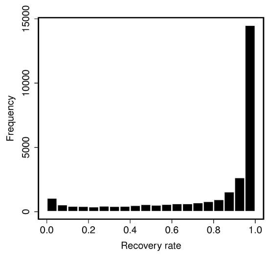 Since we are only interested in real losses, all facilities for which the default amount is 0 were excluded from our database. Furthermore, in order to exclude all cases with unreasonable cash flows and the cases which are not fully resolved, we exclude all entities for which the total sum of reported cash flows (including chargeoffs and waivers which are not present in the calculation of economic recovery rates) divided by the outstanding amount at default is smaller than 90% or greater than 105% of the outstanding amount at default. In order to exclude exceptionally low or high recoveries, we remove observations with recovery rates outside the interval . Those situations are possible because of costs and fees associated with recovery rates. Note that this sample selection is in line with Krüger and Rösch (2017) and Keijsers et al. (2018).