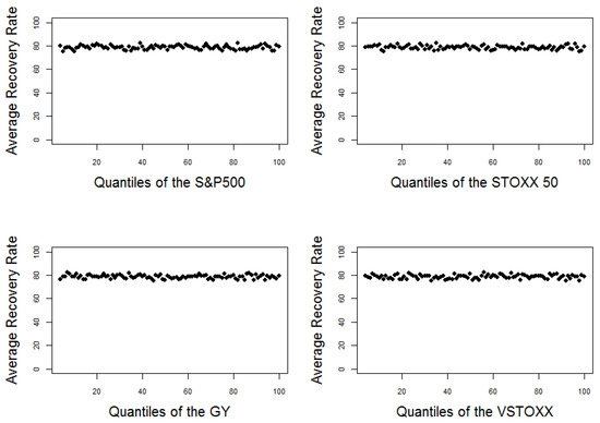 Average recovery rates computed for every percentile of S&P500 (top left), STOXX 50 (top right), GY (bottom left) and VSTOXX (bottom right).