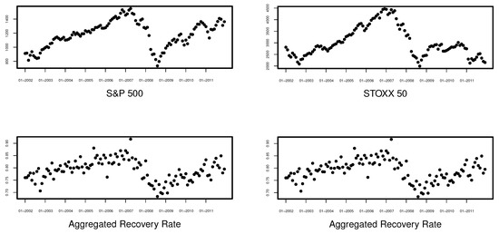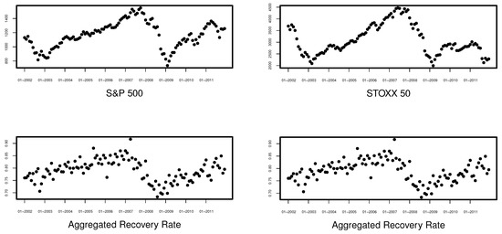 S&P500 (top left) and STOXX 50 (top right) vs. aggregated recovery rates (bottom).