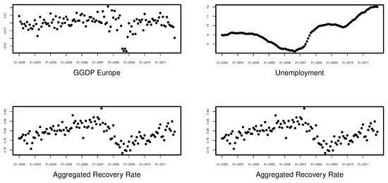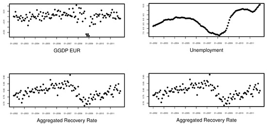 We observe rather large time shifts for the interest-rate proxies: EURIBOR: 1M, EURIBOR: 3M, and GY. Those variables are strongly correlated with interest rates set up by central banks, e.g., FED. Central banks usually do not change their rates more often than once in a quarter and the changes are very rarely higher than 0.5 percentage points. Therefore, the interest rates 18 months or 12 months after the default could reflect the economic situation related to the default much better. As terminating employees’ contracts is a long process, another very slowly changing variable is Unemployment (18 months). A large, 12-months time shift seems to be appropriate for Inflation since price changes are in most cases very slow. It is also easy to interpret the large time shift for Production (10 months). The production processes are usually planned in advance in order to assure an appropriate supply of necessary materials, intermediate products, and labor supply as well as to meet the orders of merchants. Thus, the delay in responding to a changing economic situation is significant. The reaction of stock markets is usually believed to be fast, but S&P500 and STOXX 50 comprise stocks of very different companies, which also react differently to the changes on the market and therefore a 6-months shift in the case of both indexes seems to be appropriate. GDP is released quarterly and usually reflects very quickly the condition of the economy. Therefore, 2 and 0 month shifts for the European and US GGDP, respectively, is not surprising. Finally, the volatility in the market is changing very dynamically, and not applying any time shift for this explanatory variable is economically reasonable. The relation between the optimally-shifted covariables and the aggregated recovery rates is presented in Figure 7 and Figure 8.