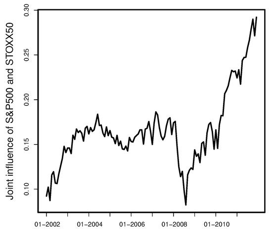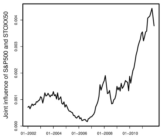 We measure this joint influence over time by mutually increasing their values by 1%. The corresponding sensitivity (change/difference) of the logarithmized RR is presented in Figure 9. We see that the joint effect on aggregated recovery rates is always positive. Another interesting finding is that the influence of the stock markets is relatively higher in prosperity times and lower in crisis times.