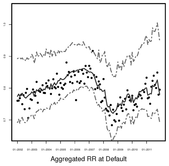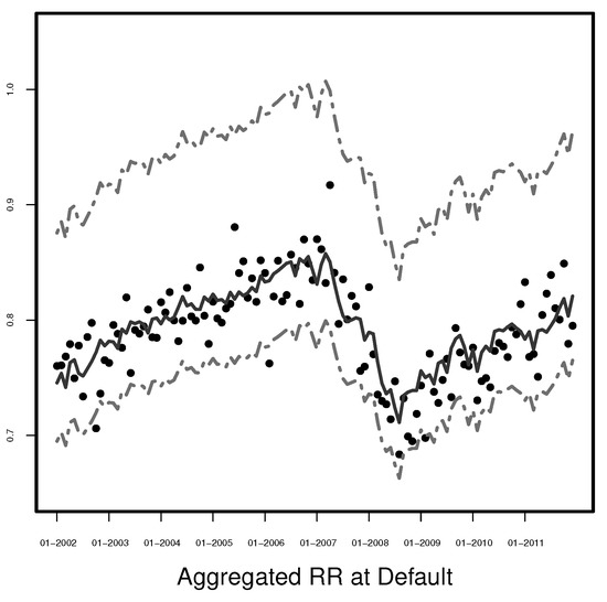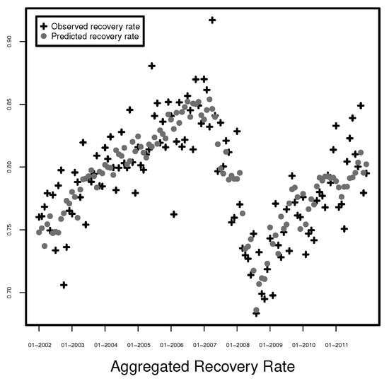The reduced model (6) has similar values of and as model (5). All explanatory variables in this model are significant at the 5% level. The coefficients of S&P500 and GGDP Europe are positive and the coefficient of the Unemployment rate is negative. This indicates that the higher the value of S&P500 or GGDP Europe the higher the recovery rate and the higher the unemployment rate the lower the aggregated recovery rates. The negative sign of the coefficient of STOXX 50 is somehow surprising. However, if this variable is considered together with S&P500 (both are the indicators of stock markets), their joint effect on aggregated recovery rates is positive.
