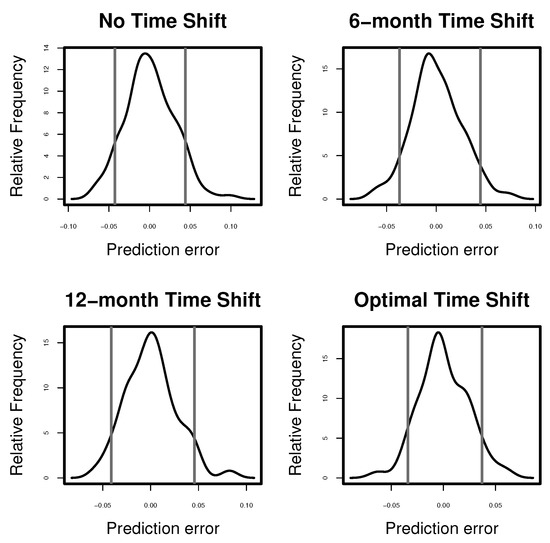 Now, we will examine the models with the same time shifts applied to all explanatory variables. In Table 5, the adjusted is reported for the models without shifts, with 6 and 12-months shifts as well as with the individual optimal shifts, as discussed in the previous subsection for comparison.