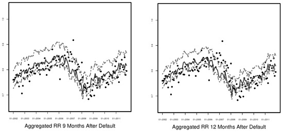 From Figure 1 and Figure 2, we clearly see that the estimators of the GGDP are different compared to the estimators obtained by linear interpolation. In contrast to the linear interpolation, where only the GDP values observed every quarter matter and other monthly fluctuations in the economy within those 3-months periods are completely neglected, our estimates reflect the information about changes in the economy contained in the broad data set used for estimation of the dynamic factor model. In the linear interpolation, we need to know the first and last observation of the considered period to estimate the values in between and thus this is a forward-looking estimation. In contrast to the linear interpolations, we do not use the observed, quarterly values, but the corresponding fitted monthly values. Especially, we expect that the estimated GGDP will let us predict the behavior of the aggregated recovery rates better. This statement is examined in the next section.