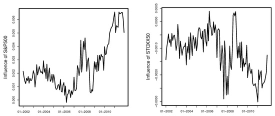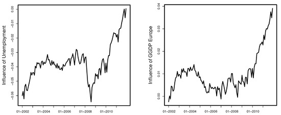 The other variables used in the regression models, 1-month Euro Interbank Offered Rate (EURIBOR: 1M), 3-months Euro Interbank Offered Rate (EURIBOR: 3M), industrial production of European countries (Production), 5-year Euro area Government Benchmark Bond yield (GY), average inflation of European countries (Inflation) and average unemployment of European countries (Unemployment) are taken from the website of the European central bank (http://sdw.ecb.europa.eu/, accessed on 31 March 2017). The VSTOXX volatility index, Dow Jones Euro STOXX 50 (STOXX 50), and S&P500 are available at https://www.investing.com/indices, accessed on 5 April 2017. In the case of Production, Inflation, and Unemployment the data concerns 19 European countries.