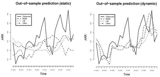 Similar to the model with unshifted explanatory variables, the above two models based on the stochastically estimated GGDP Europe and GGDP USA outperform the corresponding ones with linearly interpolated GGDP Europe and GGDP USA in terms of and adjusted . The estimation accuracy of Model (6) is presented in Figure 10, where the fitted values are plotted together with the observed values. Model (6) seems to fit the ARR very well since the estimated and observed ARR are very close to each other.