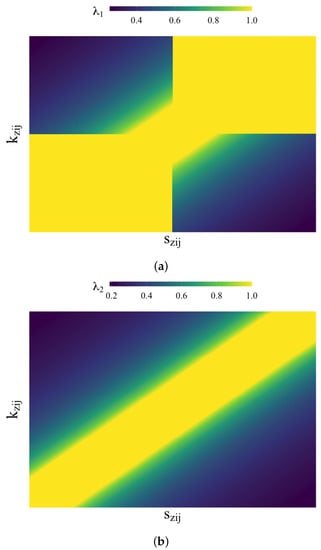 In order to gain some intuition about the functions (Equations (19)–(21)) and the impact of and , we depict them in Figure 1.
