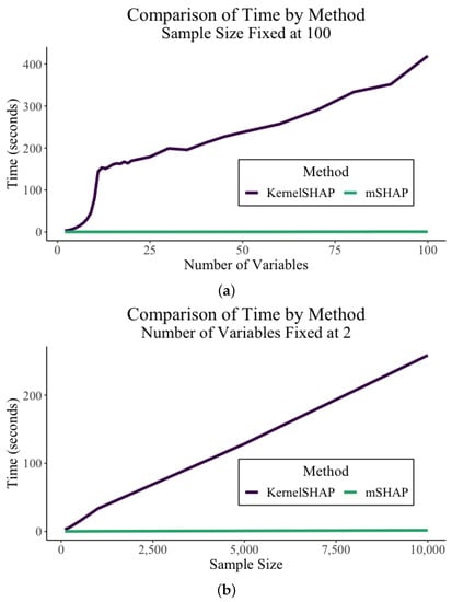 Computational time of kernelSHAP and mSHAP. (a) Fixed n. (b) Fixed number of variables.