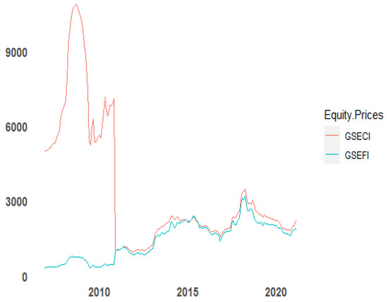 The Ghana Stock Exchange (GSE), a platform for electronic trading, has witnessed ups and downs since its inception in November 1990, followed by the institution of the GSE automated trading system (GATS) in November 2008. The GATS replaced the manual trading system to facilitate enhanced liquidity, efficiency, and earn international competitiveness, to mention a few. The indicators of the GSE deliberated in this study are made up of the GSE financial index (GSEFI) and the GSE composite index (GSECI), which comprise about 13 companies and 38 companies, respectively. The number of existing firms on the GSECI has been inconsistent, majorly due to country-specific factors. For instance, the banking sector clean-up in 2017 led to the collapse and consolidation of some financial institutions. Hence, it can be suggested that the clean-up affected most financial firms belonging to the GSEFI category. However, since a bidirectional information flow exists between the GSECI and its constituents (