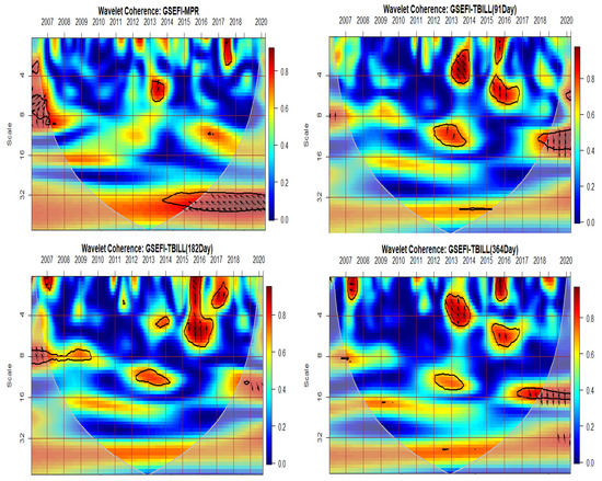 Moreover, policymakers with the quest of putting Ghana’s economy on a sustainable path should fine-tune or regulate Treasury bill rates to enhance competitiveness between the bond market and stock market for a progressive financial system. This is particularly pertinent because we found the interest rate indicators, especially the Treasury bill measures, leading the two GSE indicators in the short- and medium-term as found from both the biwavelet and wavelet multiple techniques. The directional impact was then found to be negative at most times, suggesting that a rise in Treasury bill measures is inimical to growth or a rise in the stock market in favour of the bond market. This assertion is in line with the dividend discount model, where an increase in interest rates diminishes the value of the stock market, making it less attractive. However, the outcome of the negative nexus between interest rates and stock returns is not surprising due to the growth constraints in times of poorly performing macroeconomic indicators in the Ghanaian economy (