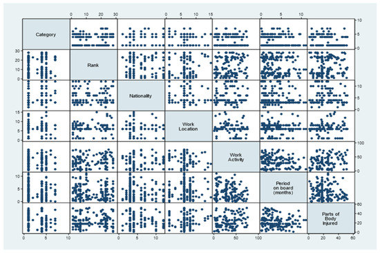 A panel correlation of the specific variables employed in the empirical analysis is presented in Figure 1, below. It should be noted that there is a high degree of correlation between the work activity, period on board, and worker injuries (number of injuries and parts of body injured).