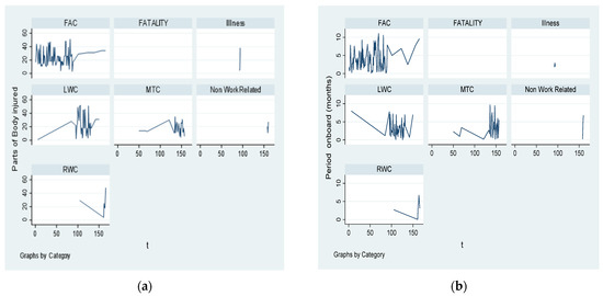 (a) Panel evolution of specific variables—parts of body injured. (b) Panel evolution of specific variables—period on board. Source: Own data process in Stata.