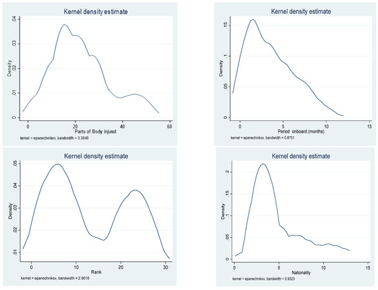 The dataset compiled for the empirical analysis covers an important number of maritime accidents observed during the 2014–2022 period and comprises several key indicators/credentials that characterize the shaping factors of maritime accidents (various injuries to workers and work-related accidents in the maritime transportation sector). All indicators were encoded using the econometric package Stata 16. They were transformed from strings into numerals to be used as variables in our econometric models and to be processed accordingly in the framework of the various advanced modeling procedures applied in this study. In total, for the entire analyzed period, there are 166 observations per variable employed in the econometric models (dataset in Appendix A).