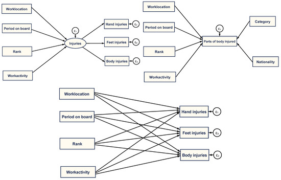 Our research methodology is based on two approaches to modeling cross-sectional data via modern and advanced econometric techniques, namely, multiple regression modeling and structural equation modeling (SEM). Multiple regression models are estimated through various estimation methods to ensure robust results, such as robust regression, random and fixed effects, two-stage least squares, Poisson regression, and dynamic GMM (Arellano–Bond). Robust regression is mainly processed to capture the deterring factors of maritime employee health/maritime accidents (approximated using hand, feet, and body injuries). Robust regression is based on calculating Cook’s distance and then running two types of iterations (Huber, biweight), thus providing robust estimates while also dropping the possible outliers in the sample. Multiple regression models are configured as in Equation (1):