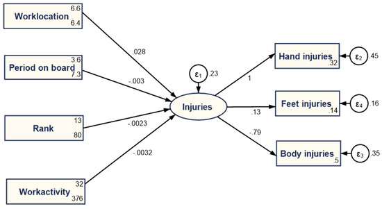 Analyzing the results, it can be observed that the structural part of the model associated with the injuries latent variable shows that particular work locations are associated with an increase in the injuries suffered by maritime workers, while more work activity tends to slightly decrease these injuries (both coefficients are statistically significant at a 5% threshold). The body injuries estimated coefficients have the highest level of statistical significance and tend to shape the amplitude of injuries suffered by maritime workers (in this case, where injuries are captured as a latent variable resulting from specific types of accidents at the level of hands, feet, and body). Period on board has a negative estimated coefficient, as in the case of the multiple regression models, yet it is less significant from a statistical point of view in the case of SEM 1. Based on the findings from this method of analysis, work activity and work location are identical to the results from the previous method, as expected.