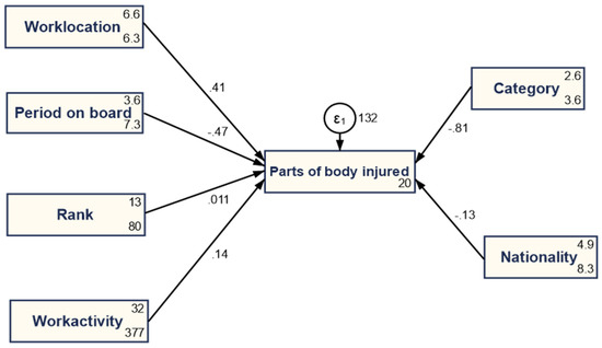 In this configuration, the SEM results highlight that work activity is essential in determining the number of various types of body injuries suffered by maritime workers (positive estimated coefficient, 0.138; highly statistically significant at 1%). Work location remains positive, as in the case of the previous results, while period on board remains negative, as well as nationality and category, yet it is less significant from a statistical point of view.