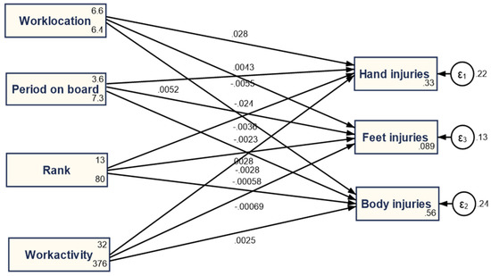 Finally, the third structural equation model (SEM 3) captures the multiple causal associations between all variables (specific types of injuries and various deterring factors/determinants) considered in this empirical analysis. The results obtained are detailed in Figure 7 and Table 6, above. In this particular setting, work location tends to stand out as a main determinant of hand injuries (positive coefficient and statistically significant at 5% level), yet all the other coefficients have small values and are less significant from a statistical perspective, thus revealing that causalities exist. Still, specific/tailored configurations and associated measures are needed to isolate the incidents/limit injuries and, hence, ensure the general health and well-being of maritime workers.