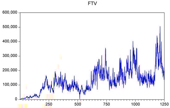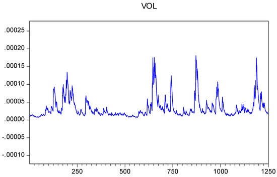 The descriptive statistics of variables that are employed in the model are summarized in Table 2. It is shown that the volatility of spot market returns measured by conditional variances ranges from 0.00001 to 0.00018 with a mean of 0.00001. Figure 1 plots volatility of spot market returns from 10 August 2017 to 10 August 2022. In addition, Table 2 reveals that the daily index futures trading volume fluctuated highly over the sample period, ranging from 487 to 505,677, with a standard deviation of 81,603. Specifically, Figure 2 shows that the daily index futures trading volume increased significantly during the period from 2017 to 2022.