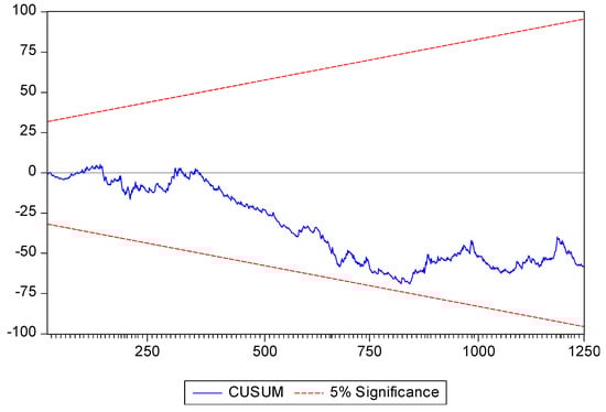 To check the long-term stability of the coefficients in the model, the cumulative sum of the recursive residuals (CUSUM) and the cumulative sum of squared recursive residuals (CUSUMSQ) tests developed by Brown et al. (1975) are employed in this study. Figure 3 and Figure 4 show that the plots of CUSUM and CUSUMSQ, respectively, lie inside the critical bounds at the five percent level of significance. Therefore, it can be concluded that the model used is stable over the sample period.