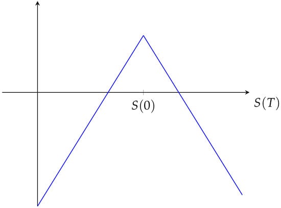 Profit function of a pure short straddle without securing long positions at the money. S denotes the S&P500 index value. The profit/loss (above/below the horizontal axis) depends on the final value of the S&P500 at time T.