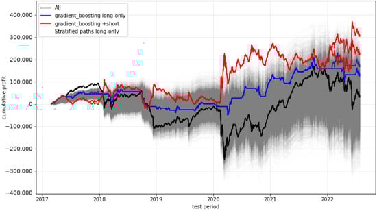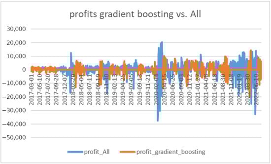 In Figure 12, we illustrate the distribution of profits per trade of the “All-strategy” (blue) and of the “gradient-boosting strategy” (orange). Again, it can be seen that the gradient-boosting approach avoids the really large losses.