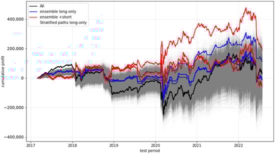 - long-and-short total profit: essentially the same as the total profit above, but instead of 0 (do not trade), we use −1, therefore shorting the strategy in those cases instead of not trading at all.