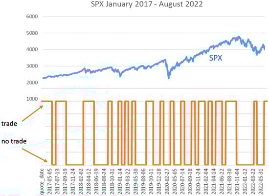 In the following discussion, we consider a flexible family of option trading strategies which was defined in detail in () (see also Section 2.1 below), and which was named there as the “Lambda Strategy”. The basis of all variants of this family is a short straddle on the S&P500 with strike near to the money. This family of strategies, by a flexible, discretionary choice of the variants has led to significant success in real trading (carried out by the second and the last author) over several years. Therefore, analyzing the strategy in () and not observing really good performance in a static back-testing (i.e., with pre-defined, not flexible, use of the variants) was quite surprising for us. Therefore, in (), we concluded that more dynamic decision-finding about how to choose the variants could prove helpful, perhaps by using certain machine learning approaches. In this paper, we follow this suggestion and start out by breaking the general problem down into a basic approachable classification task. Put simply, our goal is to train a machine learning model to decide if one should open a basic (“naked”) straddle (i.e., the pure basic building block of the Lambda strategy without any further variant) for given market data, or not.