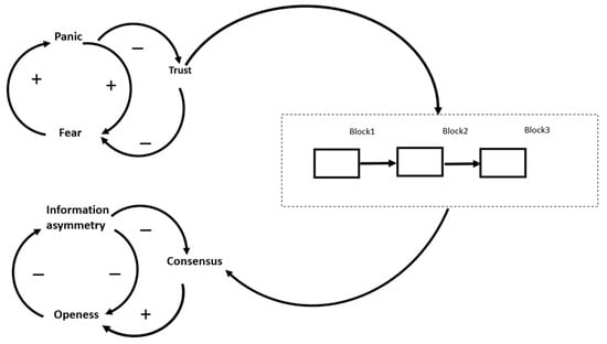 The impact of the blockchain application on the whole financial system is presented in Figure 5. When every participant has the same information, it creates consensus among all of them. In consequence, the information asymmetry decreases, and it reduces the possibility of suboptimal behavior. In consequence, it increases the resilience of the system and reduces the risk of a future crisis.
