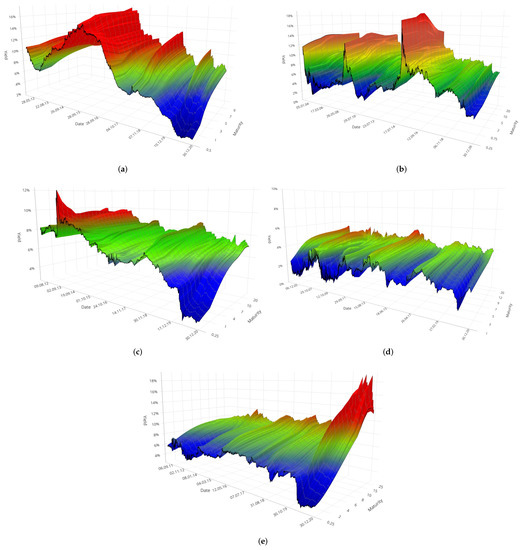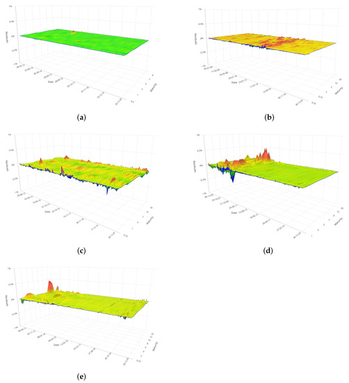 Surface of daily residuals for the yield curve obtained with the 5F–DRF in the BRICS bond market of Brazil (a), Russia (b), India (c), China (d), South Africa (e).