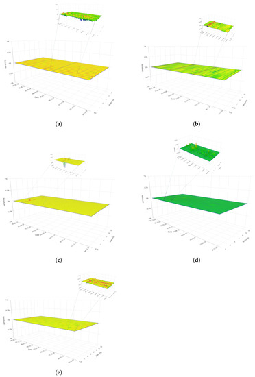Surface of daily residuals for the yield curve obtained with the FFNN in the BRICS bond market. As the error surface is very flat, the inset shows a zoomed–in area highlighting the error fluctuations otherwise not visible at the same scale employed to visualize the error surface of the 5F–DRF. From top to bottom and from left to right, (a) is associated to Brazil, (b) to Russia, (c) to India, (d) to China, (e) to South Africa.
