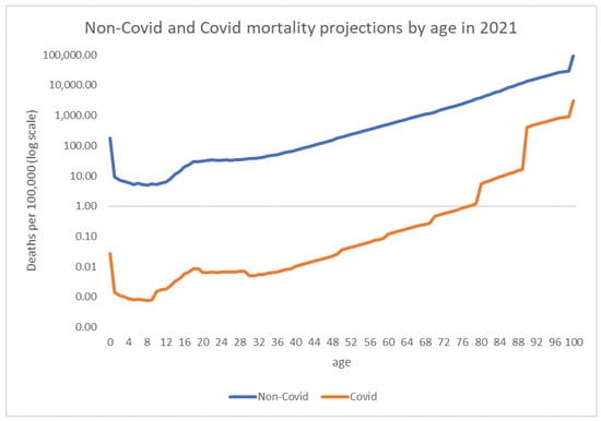 Non-COVID-19 and COVID-19 death projections by age for the year 2021.