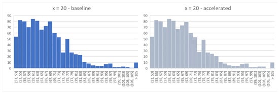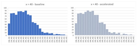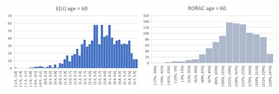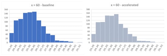 As Table 4 for all ages, the expected cash flows for the baseline scenario and the accelerated scenario are similar, showing some differences only for very large values of t that do not affect the value of . Furthermore, no particular differences emerge when comparing the distributions by age and mortality basis. The results are shown in Figure 3, Figure 4 and Figure 5. Therefore, both in terms of expected values and variability, cash flows and s are little affected by the mortality shock due to COVID-19.