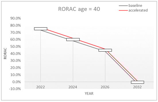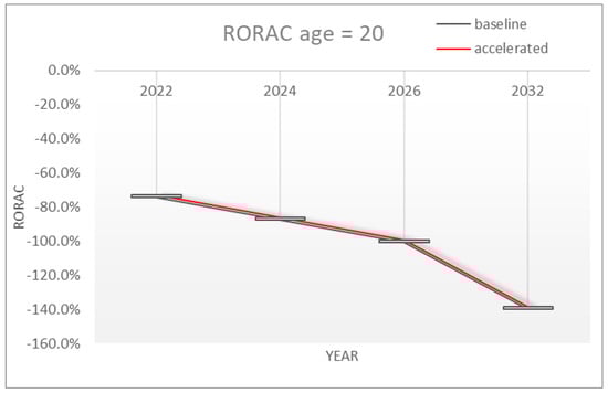 As Table 6 shows, for a policyholder aged 20, the insurance company is at loss with huge negative −101.0%, which reduces only to −99.6% considering the COVID-19 effects. Contracts with policyholders aged at least 40 maintain reduced profitability compared to the previous two years but are still satisfactory, even more so considering an increase in with acceleration due to COVID-19 of at least 3.6%. In summary, considering the data relating to the year 2026, the acceleration of mortality due to COVID-19 entails a negligible increase in profitability compared to the increase in longevity from the year 2022 to the year 2026.