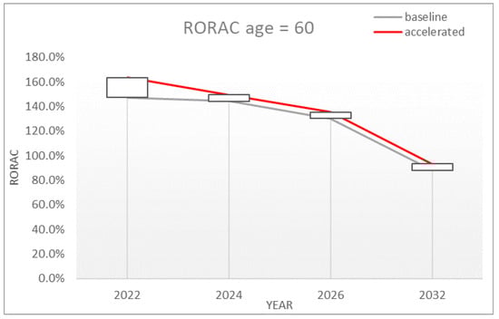 As Table 3 shows, for policyholders aged 20, the contract is at a loss even without COVID-19 acceleration. This is due to the technical basis used to determine the expenses loaded premium, already inadequate to determine future longevity of the age considered. Furthermore, the is negative, and the mortality increase due to COVID-19 determines an increment of only 1.5%. For the year 2022, the pandemic acceleration causes an increase in profitability at most equal to 16.1% of . Furthermore, for ages 40 and 60, there is a huge profit for the insurance company even without considering the effects of the pandemic on mortality.