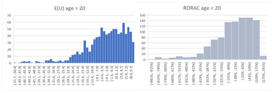 Table 3 and Tables 5–7 show the effects of COVID-19 acceleration, comparing (for an immediate annuity contract for policyholders of age x = 20, 40, and 60), the pure premium (), the best estimate of liability (), the solvency capital requirement (), the cost of capital (), the expected value of the profit (), and the . Table 3 relates to an annuity contract signed in 2022.