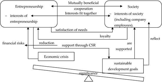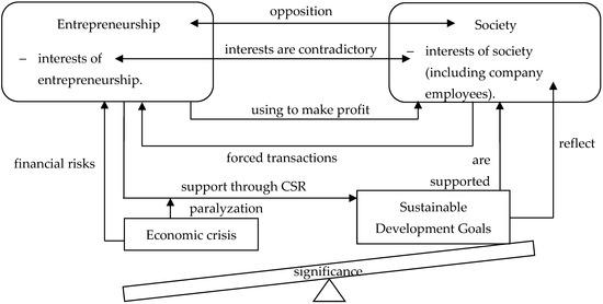 The SDGs are supported in society and reflect its interests. Entrepreneurship supports the SDGs through the manifestation of corporate social responsibility. The economic crisis is less important than the SDGs—i.e., it fades into the background. The crisis increases financial risks, but entrepreneurship successfully reduces/overcomes these financial risks with the help of corporate social responsibility. In the new approach, the beneficiaries are entrepreneurship (reduction of financial risks, increased robustness against crisis) and society (business covers society’s losses that are caused by the crisis). The crisis still limits opportunities for implementing government programs in the sphere of sustainable development and the practice of corporate consumption, but support for the SDGs in entrepreneurship allows compensating for losses, preserving the achieved results, and the rate of sustainable development.