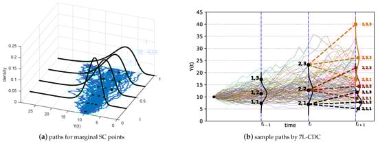 where , , represents the ANN function which approximates the j-th collocation point when , and the j-th conditional collocation point when . When , . Figure 2 shows an example of the distribution of the conditional SC points when and . When the matrices have been defined, all sample paths are compressed into a structured matrix. In other words, matrix contains all of the information needed to perform the Monte Carlo simulation of the SDEs, apart from the interpolation technique.