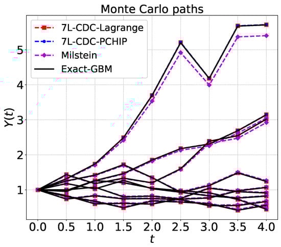 By the compression–decompression procedure, Monte Carlo sample paths based on SDEs can be recovered from a 3D matrix. We then employ the 7L scheme procedure only to compute the entries of the encoded matrices at time point (see Section 4.1), which leads to a reduction of the computational cost in many cases.