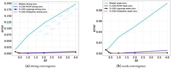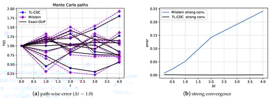 Moreover, the strong convergence property of an SDE discretization is important in many cases. When valuing so-called path-dependent options, for example, improved strong convergence enhances the convergence of a Monte Carlo simulation. Options are governed by their pay-off function (i.e., the option value at the final time of the contract, ). Here we consider a path-dependent exotic option, the so-called European-style Asian option, which has a payoff that is based on a time-averaged underlying stock price. For example, the pay-off of a fixed strike Asian option is given by