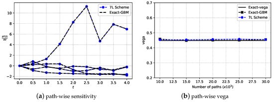 where is known at the previous time point. Like simulating the Monte Carlo paths, the calculation of this derivative is done iteratively. Figure 9a compares the pathwise sensitivities obtained via Equations (37) and (51). Clearly, the pathwise derivative by the 7L scheme is very similar to the analytical solution. Figure 9b confirms that the ANN methodology computes a highly accurate Asian option Vega by means of the above pathwise sensitivity. Summarizing, the sensitivity with respect to model parameters can highly accurately be obtained from the trained ANNs. As the 7L-CDC scheme is composed of marginal and conditional collocation points, the above procedure of computing the pathwise sensitivity is also applicable to the variant 7L-CDC, by using the chain rule.