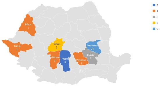 The map below (Figure 3) shows the distribution by CRESTA zones of all 108 earthquake events that occurred between January 984 and September 2021, with a magnitude ≥ 6 on the Richter scale. The epicenters of the earthquakes are concentrated in eight CRESTA zones, most of them being located in the Vrancea area (84.26%).