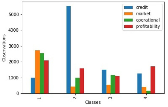 Figure 2 shows the distribution of observations in our dataset by risk class. Most risks show a balanced distribution of classes, except for credit risk, which has significantly more observations on class 2. Using oversampling and undersampling techniques to deal with this issue was pondered. However, this distribution reflects the frequency of each class in the real world, so as a consequence we decided not to balance the dataset.