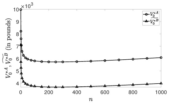 The detailed derivation of (30) is reported in Appendix A. The solution of the system of Equations (28) and (29) (when it exists) provides the optimal values for and in Case B. However, due to the complexity of this system of equations, we are unable to find explicit formulas for the solution of Problem 3. Therefore, in what follows, we numerically solve Problem 3 to find the optimal values and .