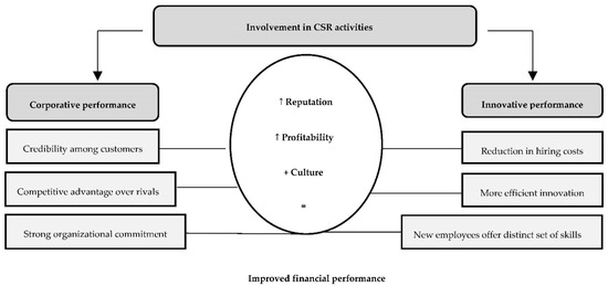 According to the study of Macgregor and Fontrodona (2008), involvement in CSR activities gives companies access to a structure that allows them to innovate sustainably and with less risk. The same author suggests that companies that do not consider CSR activities may have difficulties surviving as they will face problems innovating. A high level of involvement in CSR activities increases the economic value of a company’s innovation due to greater efficiency in innovation activities and lower hiring costs. Moreover, companies involved in CSR activities are able to easily obtain access to financing, thus allowing the company to transfer its innovative ideas to products, services, or even improvements to its organizational processes (Im et al. 2020). Bocquet et al. (2013) states that companies involved in these activities are more likely to be innovative in terms of their productive processes and the generation of new products. Figure 1 presents the interconnection of these aspects, evidencing the two dimensional effect of CSR actions in either innovative and financial dimensions. The involvement in those actions will raise firm reputation and profitability while consolidating its culture which will persistently boost the positioning in the market and increase the attractiveness towards investors and stakeholders.
