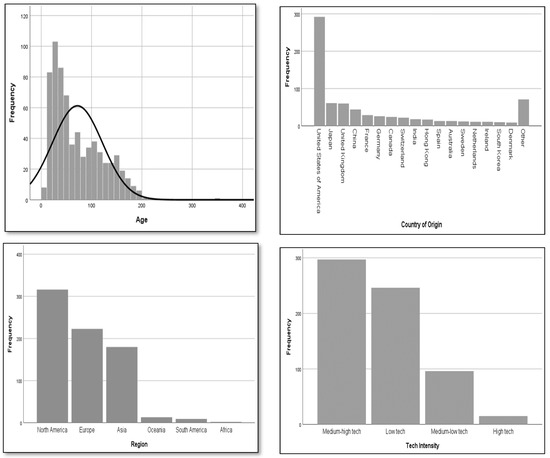 The empirical analysis performed to validate the research question relies on data collected from the top (largest) 1000 companies listed on the Thomson Reuters Eikon Datastream database. The verification of an important number of missing observations for the relevant variables in use allowed the maintenance of 744 of the companies listed, all of them present in the stock exchange. This procedure allowed the construction of a quasi-perfectly balanced panel covering the period of 2015–2019. Data from the last year of analysis were used as a reference. For a complete characterization of the sample and to ensure that any relationship found between innovation and social responsibility activities are not the result of other structural factors, variables such as sectoral technological intensity, age, and company size were also collected. The sample consists of companies spread over 39 countries from 6 different continents, with the most predominant countries being the United States of America (39%), Japan (8.2%), and the United Kingdom (8.1%). The average age presented by companies is 71 years, and 25 different sectors are present, with the financial and electronics industries being the most recurrent. Additional sample information can be found in Figure 2 below.