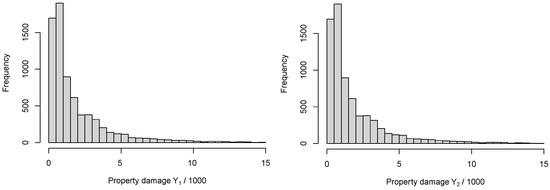 The summary statistics for and are shown in Table 1 and Figure 1. As was expected, both and are positively skewed. Furthermore, the Pearson correlation test indicates that it is appropriate to model both types of claim costs based on a single bivariate model rather than two independent univariate models.