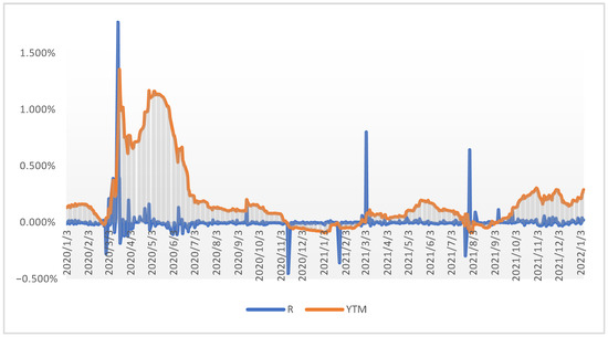 It could be seen in Figure 3 that the highest levels of negative values of yield return are registered in those periods when YTM also becomes negative. Here in bond issue BG15/27, unlike the riskiest Kazakhstan’s Sovereign Bonds, we observe periods of negative YTM values. The highest levels of negative values of yield return were registered on 13 November 2020 in the amount of −0.45%, on 25 January 2021 in the amount of −0.356%, and 23 July 2021 in the amount of −0.294% daily.