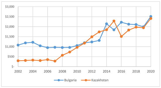 Government debt per capita (USD) Kazakhstan vs. Bulgaria. Source: Created by the authors based on data https://countryeconomy.com.